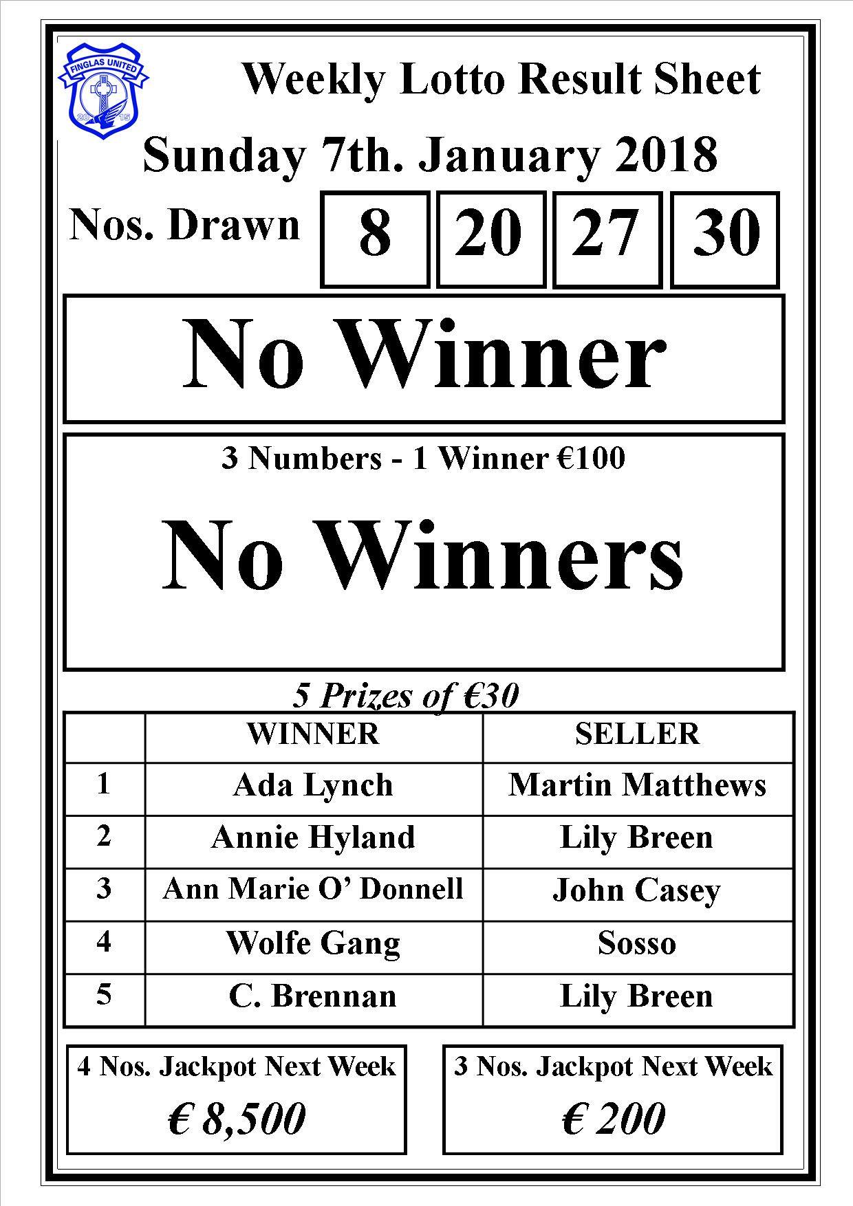There was no winner of the Club Lotto held on Sunday the 7th of January 2018. The winning numbers were 8, 20,27and 30.