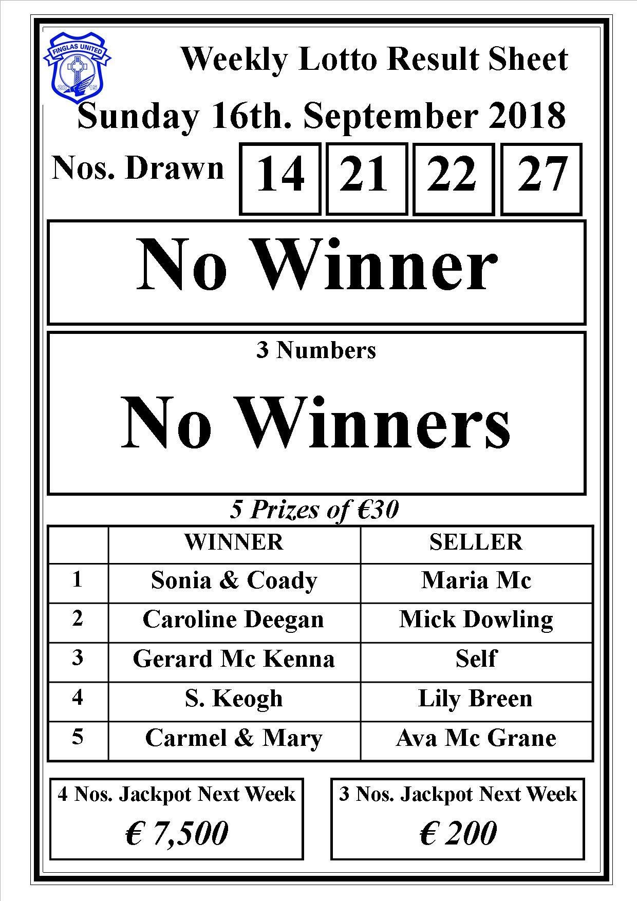 There was no winner of the club lotto last night. The winning numbers were 14,21,22 and 27.
