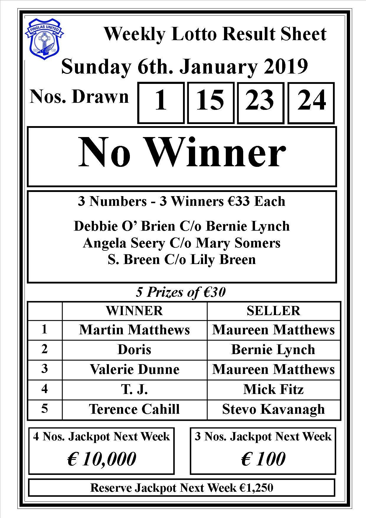 There was no winner of the club lotto last night. The winning numbers were 1,15,23 and 24.