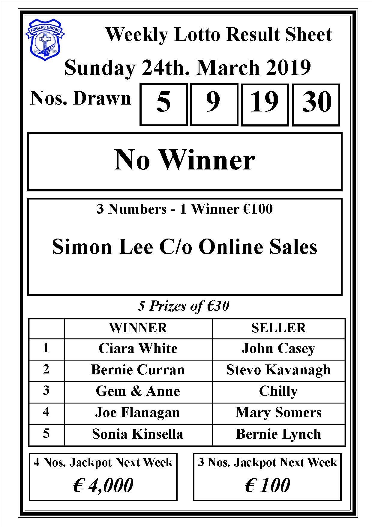 There was no winner of the club lotto last night. The winning numbers were 5,9,19 and 30.