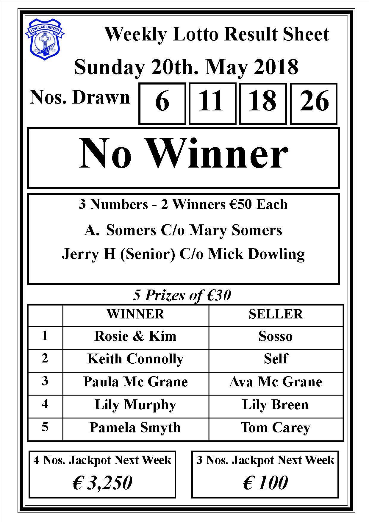 There was no winner of the club lotto last night. The winning numbers were 6,11,18 and 26.