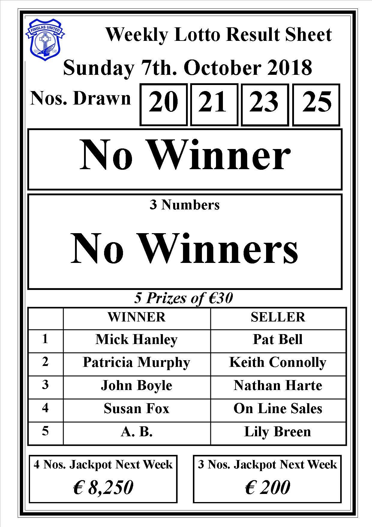 There was no winner of the club lotto last night. The winning numbers were 20,21,23 and 25.