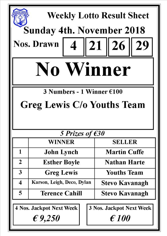 Next weeks jackpot is €9250 , lotto's are available from any team manager, committee member or online through the link below