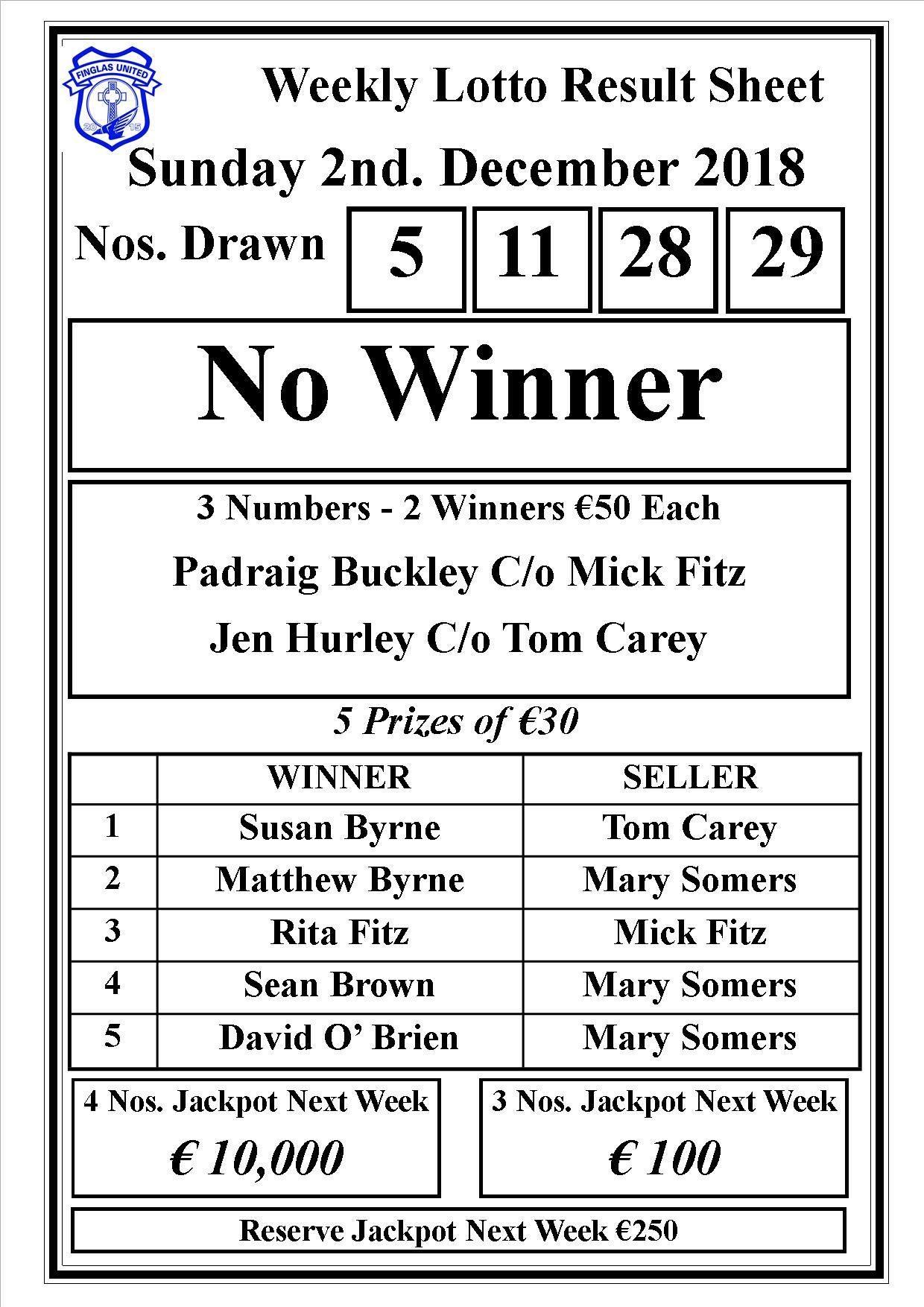 There was no winner of the club lotto last night. The winning numbers were 5,11,28 and 29.